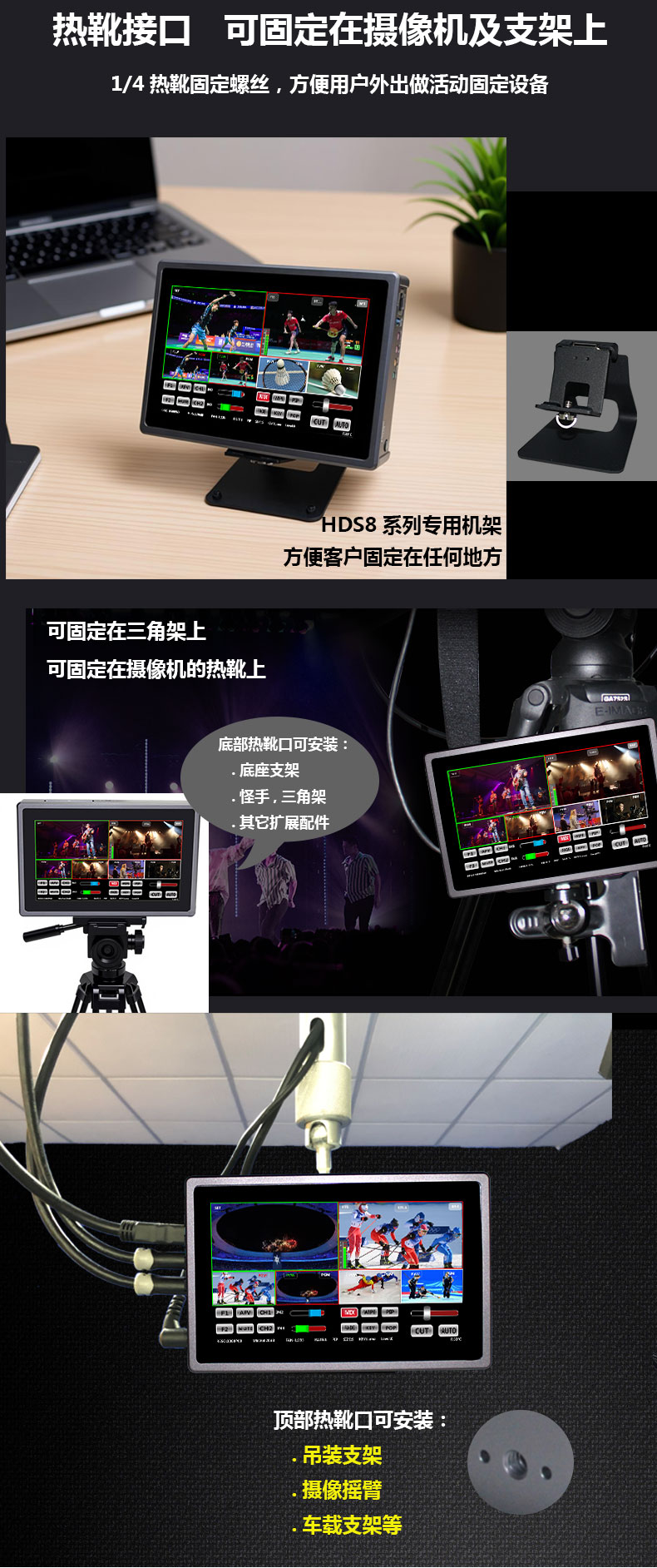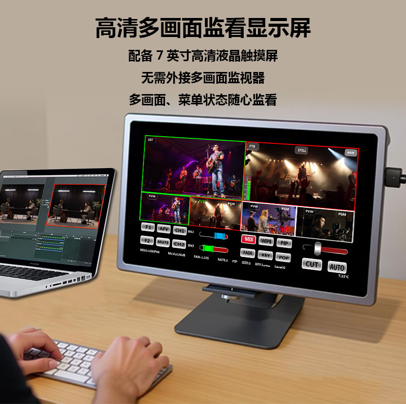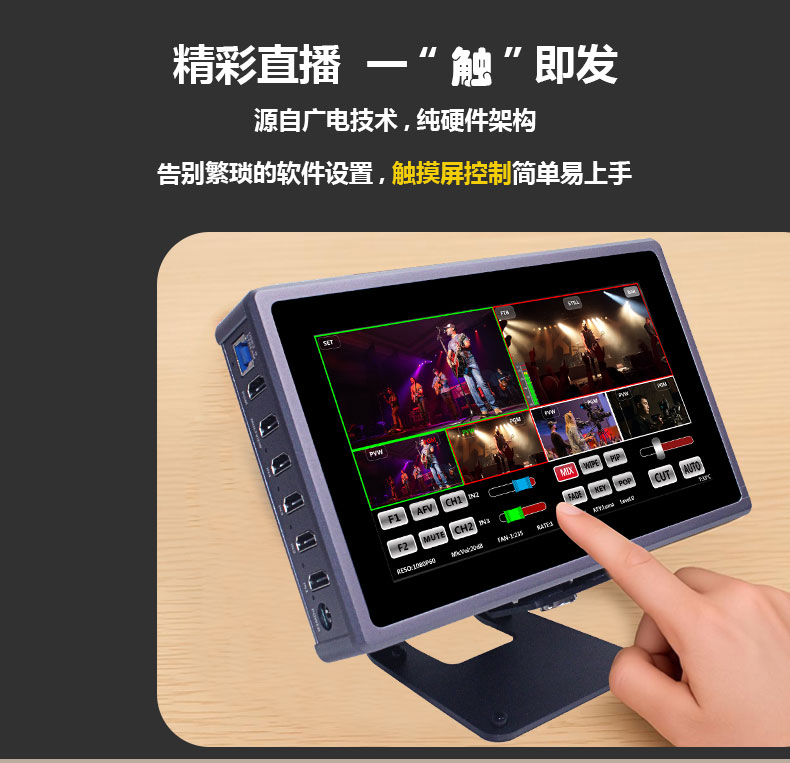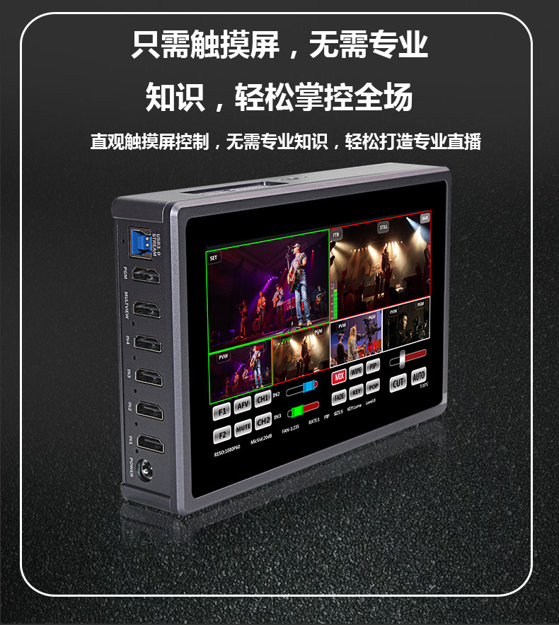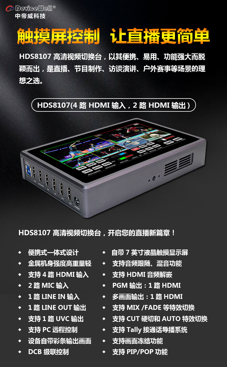 中帝威7英寸触摸屏切换台HDS8107以其便携、易用、功能强大脱颖而出,是直播、节目制作、访谈演讲、户外赛事等场景的理想之选