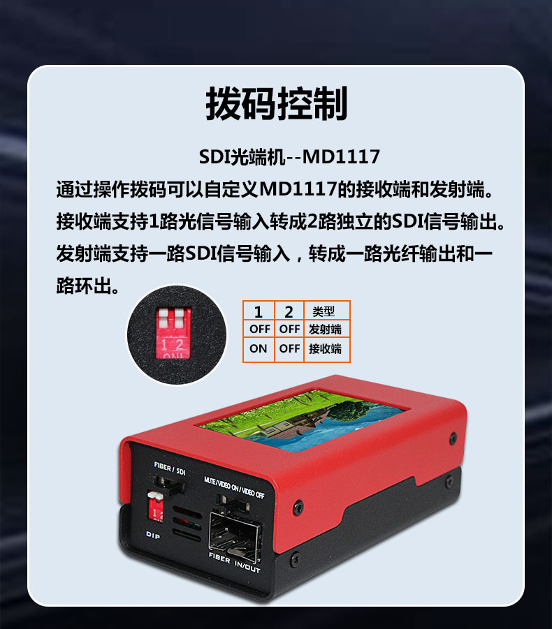 SDI光端机--MD1117 通过操作拨码可以自定义MD1117的接收端和发射端。 接收端支持1路光信号输入转成2路独立的SDI信号输出。 发射端支持一路SDI信号输入,转成一路光纤输出和一 路环出。