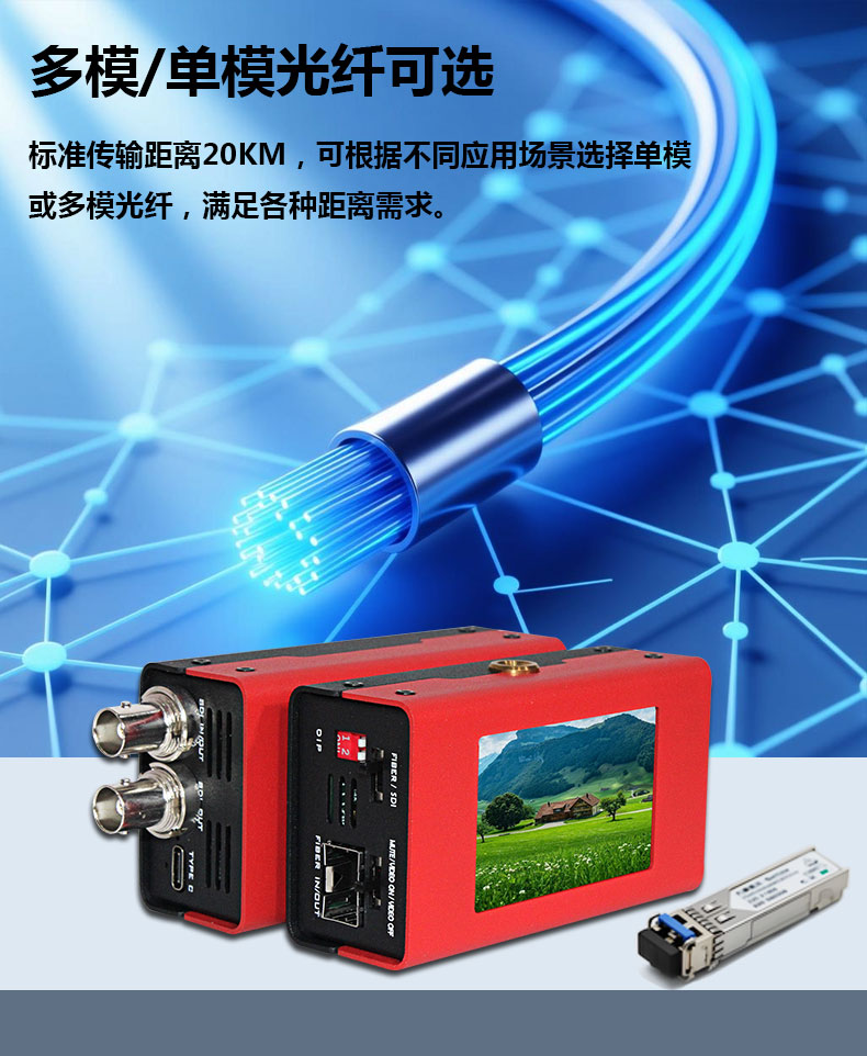 标准传输距离20KM,可根据不同应用场景选择单模 或多模光纤,满足各种距离需求。