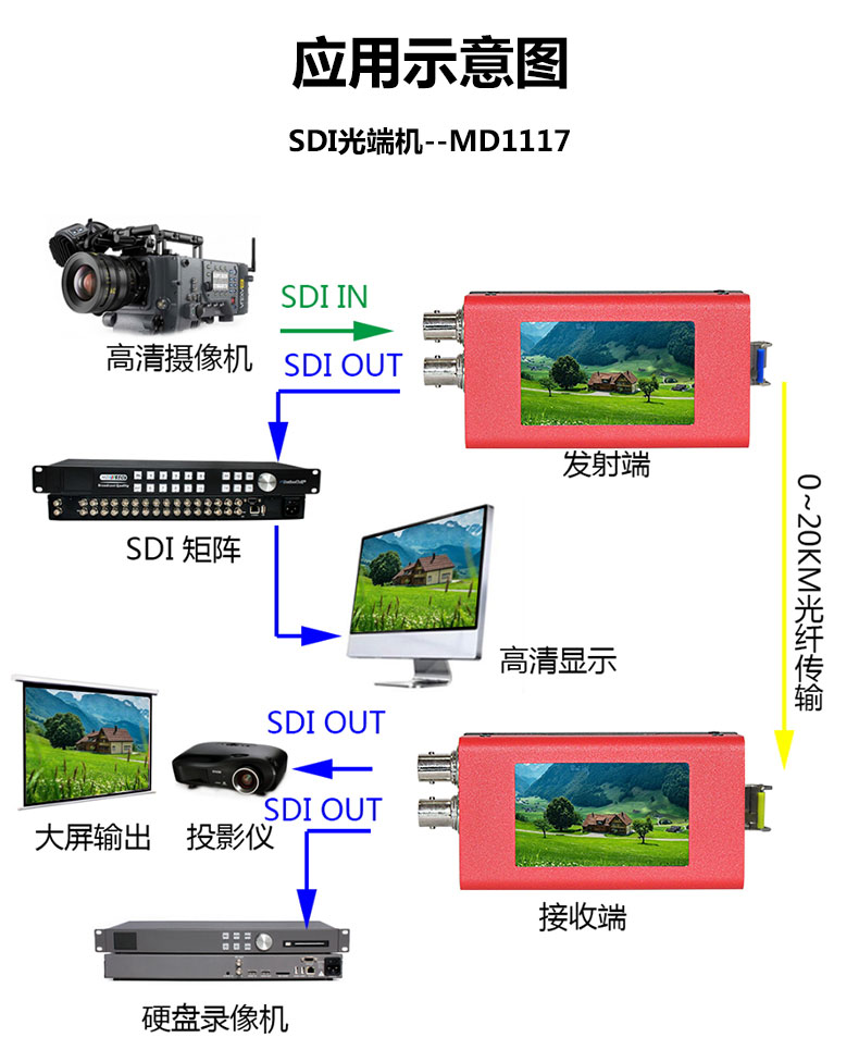 SDI光端机--MD1117 可广泛应用于广播电视台、影视制作、视频会议、安防监控、医疗影像、教育培训、体育赛事、歌舞表演、婚庆和多媒体教学等领域。