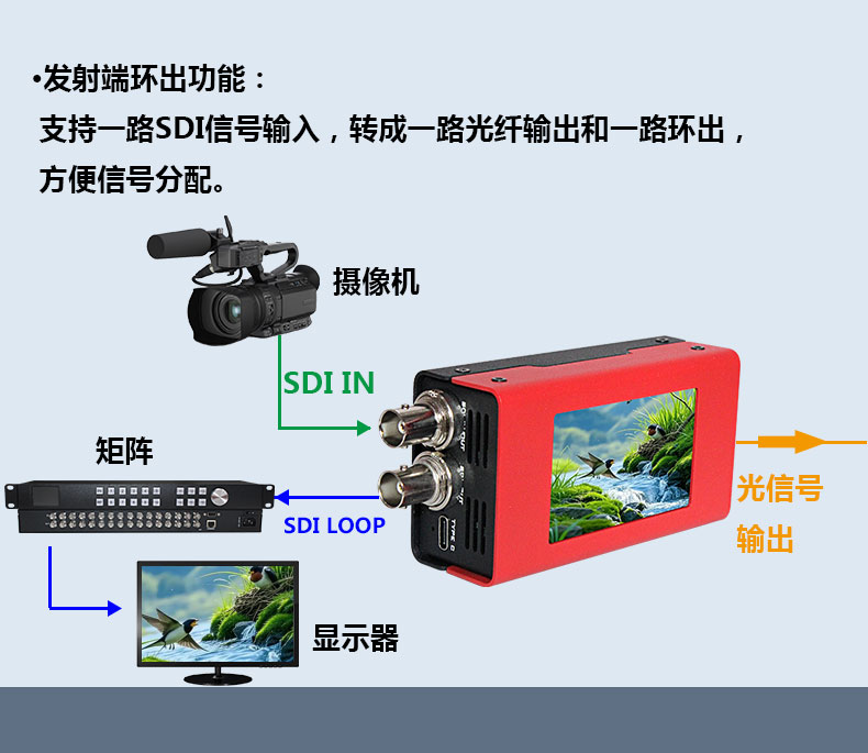 发射端环出功能: 支持一路SDI信号输入,转成一路光纤输出和一路环出, 方便信号分配。