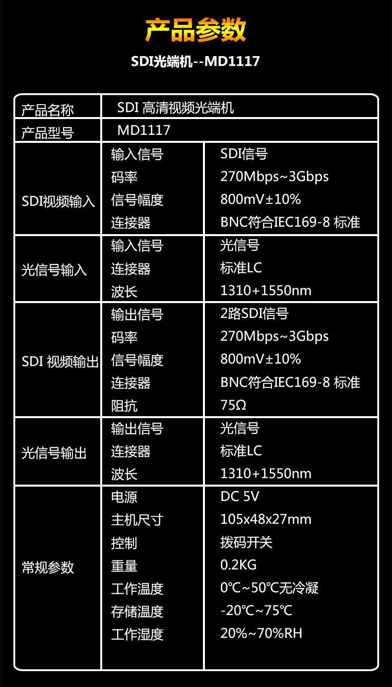 SDI光端机--MD1117 该设备基于SDI信号设计的光信号传输系统,分辨率最高可达1920*1080 60Hz。最高支持3G SDI信号,向下兼容1.5G SDI及270M SDI信号,满足广播级高清视频传输需求。
