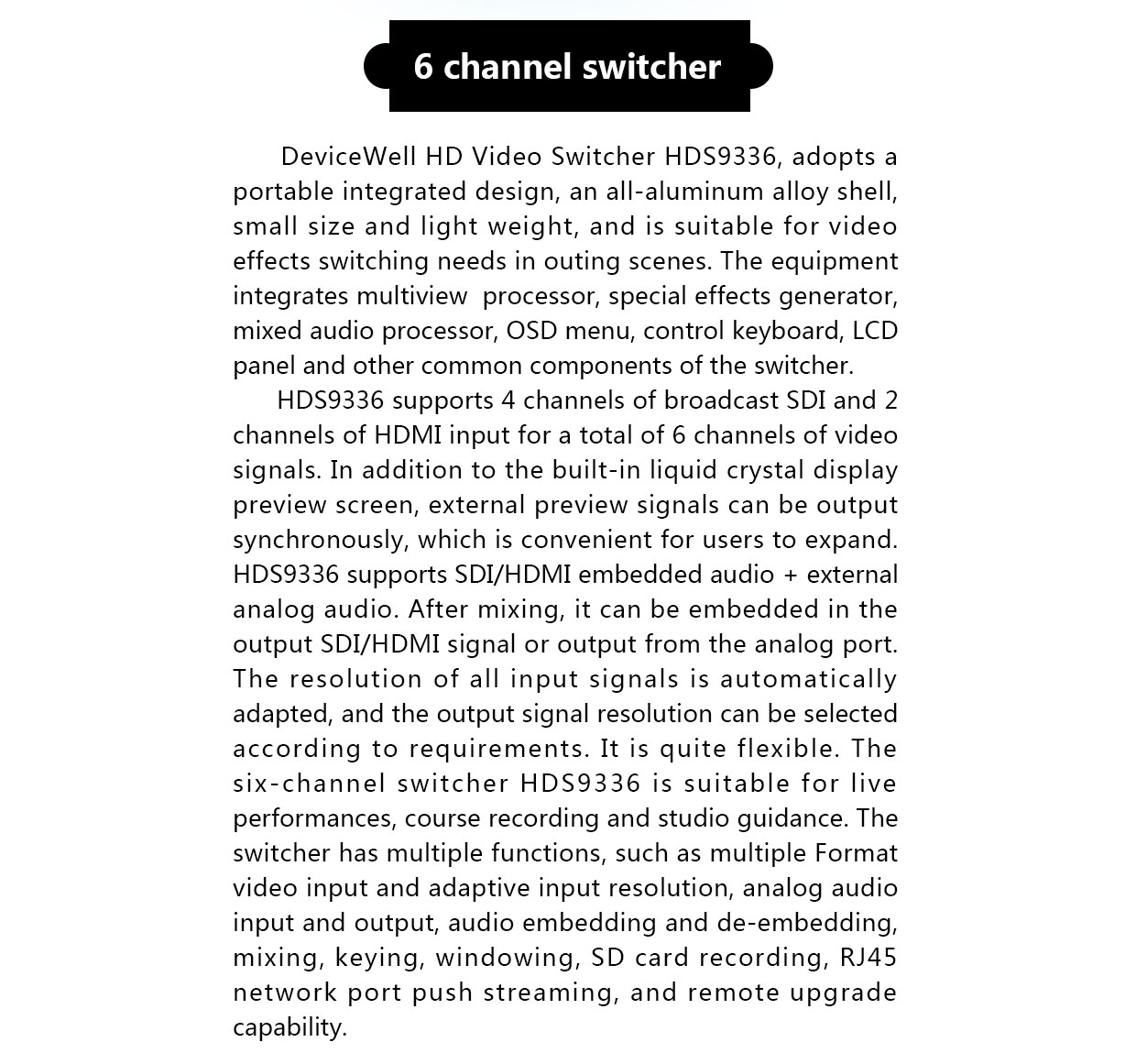 Switcher with vertical sreen video streaming function HDS9336 Users’ Manual alibaba:https://devicewell.en.alibaba.com/ Switcher Video switcher upgrading synchronizing < Prev Next >