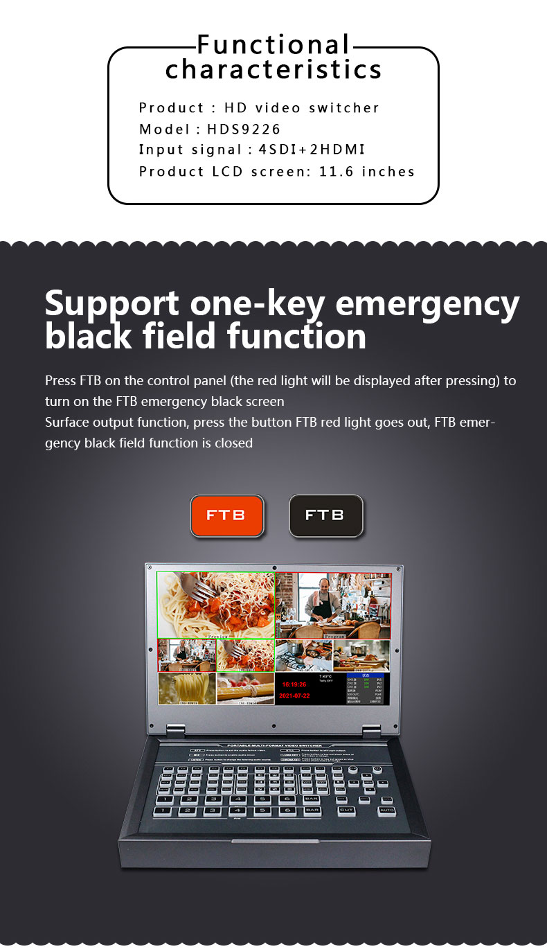 DeviceWell HD Video Switcher HDS9226, adopts a portable integrated design, a clamshell metal shell, and an 11.6-inch LCD display. Standard size: 285*190*43mm, suitable for video effects switching requirements in small outdoor scenes . The equipment integrates common components of switcher such as multiview processor, special effect generator, audio processor, control keyboard and so on.