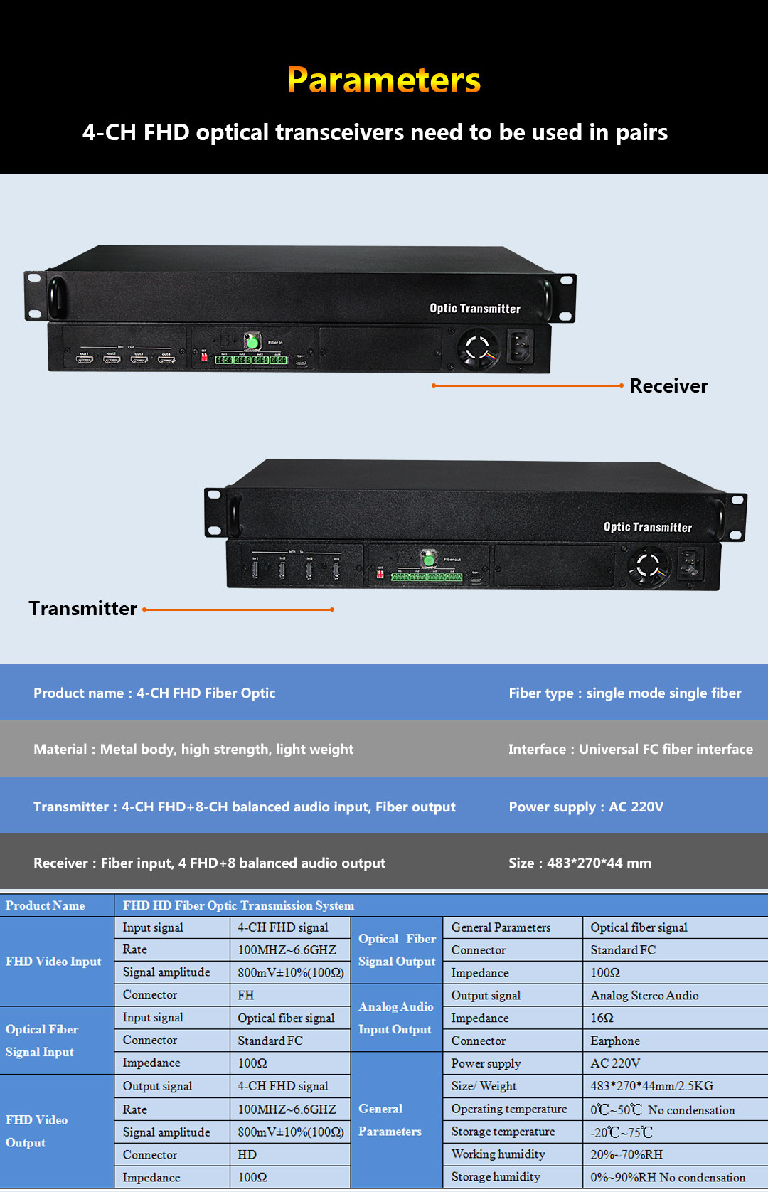The receiving end supports 1 channel optical signal input into 4 channels independent DP/DVI/XVI signal output with 8 channels balanced audio output. The transmitter supports 4 channels of DP/DVI/XVI signal input, converted into 1 channel of optical fiber output with 8 channels of balanced audio input.
