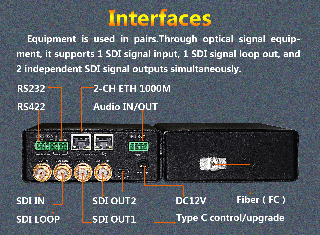 Optical signal transmission system designed based on broadcast-grade 12G SDI signals. Video lossless transmission, no compression, no delay, no video lag. SDI signals support 12G/6G/3G/1.485G/270M。