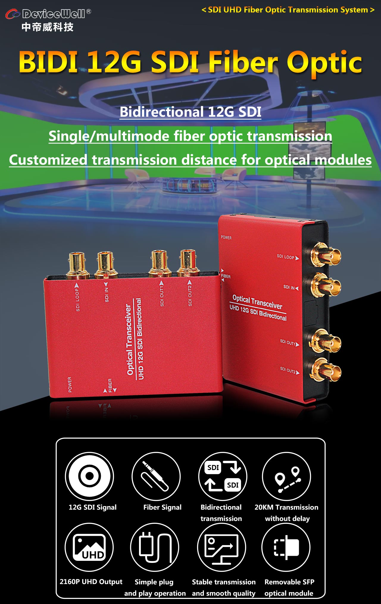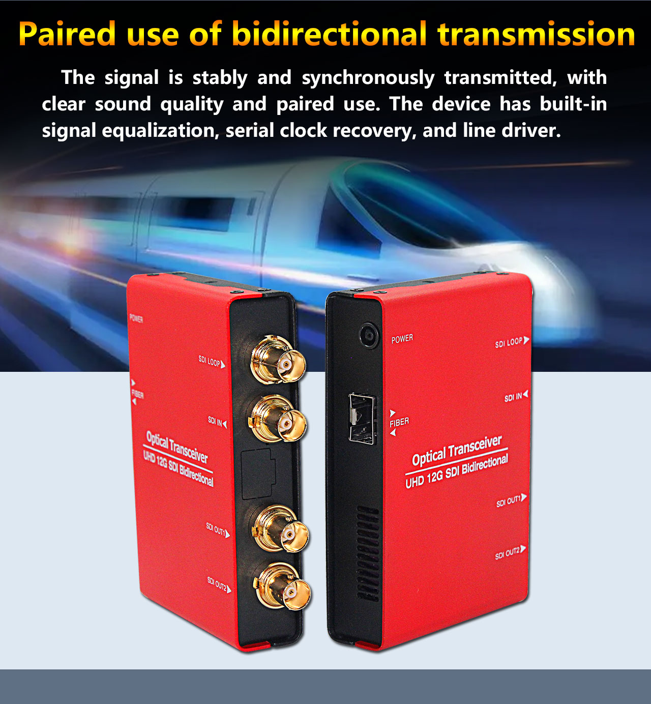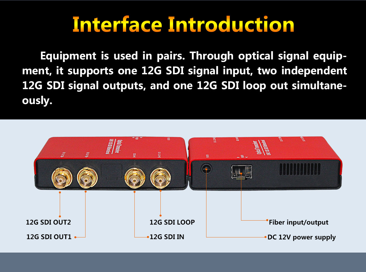 Equipment is used in pairs. Through optical signal equipment, it supports one 12G SDI signal input, two independent 12G SDI signal outputs, and one 12G SDI loop out simultaneously.