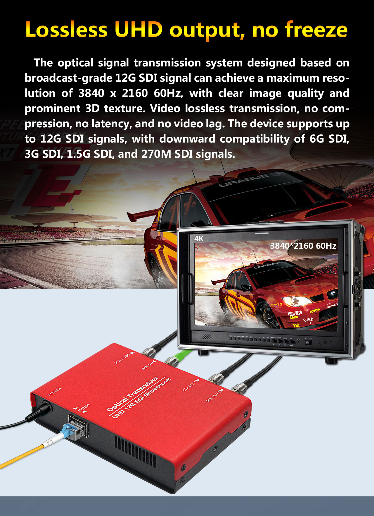 The optical signal transmission system designed based on broadcast-grade 12G SDI signal can achieve a maximum resolution of 3840 x 2160 60Hz, with clear image quality and prominent 3D texture. Video lossless transmission, no compression, no latency, and no video lag. The device supports up to 12G SDI signals, with downward compatibility of 6G SDI, 3G SDI, 1.5G SDI, and 270M SDI signals.
