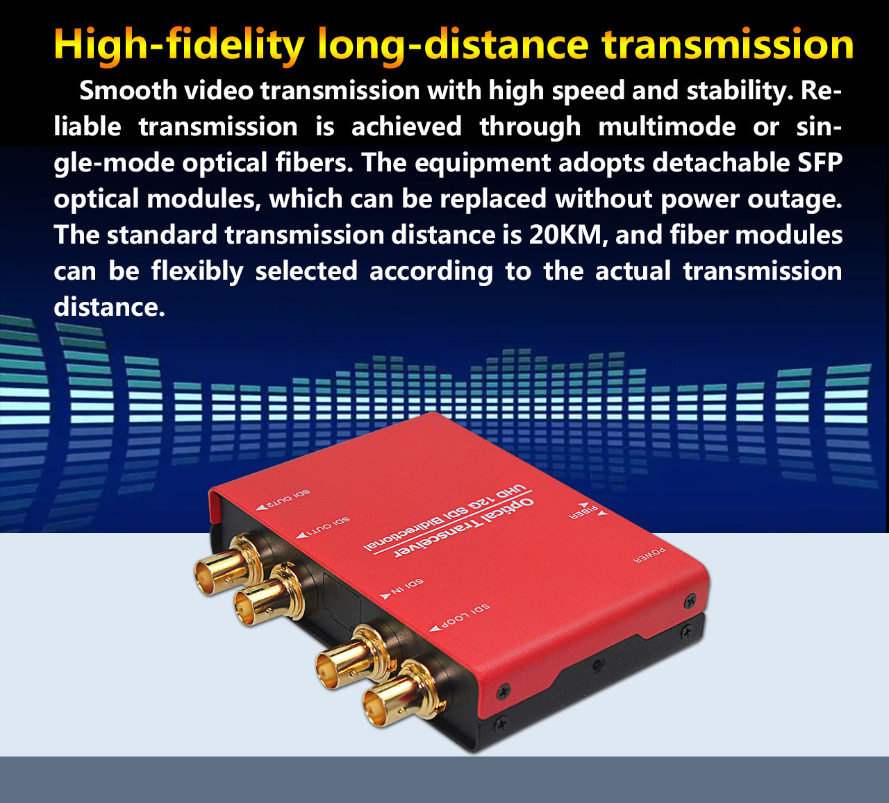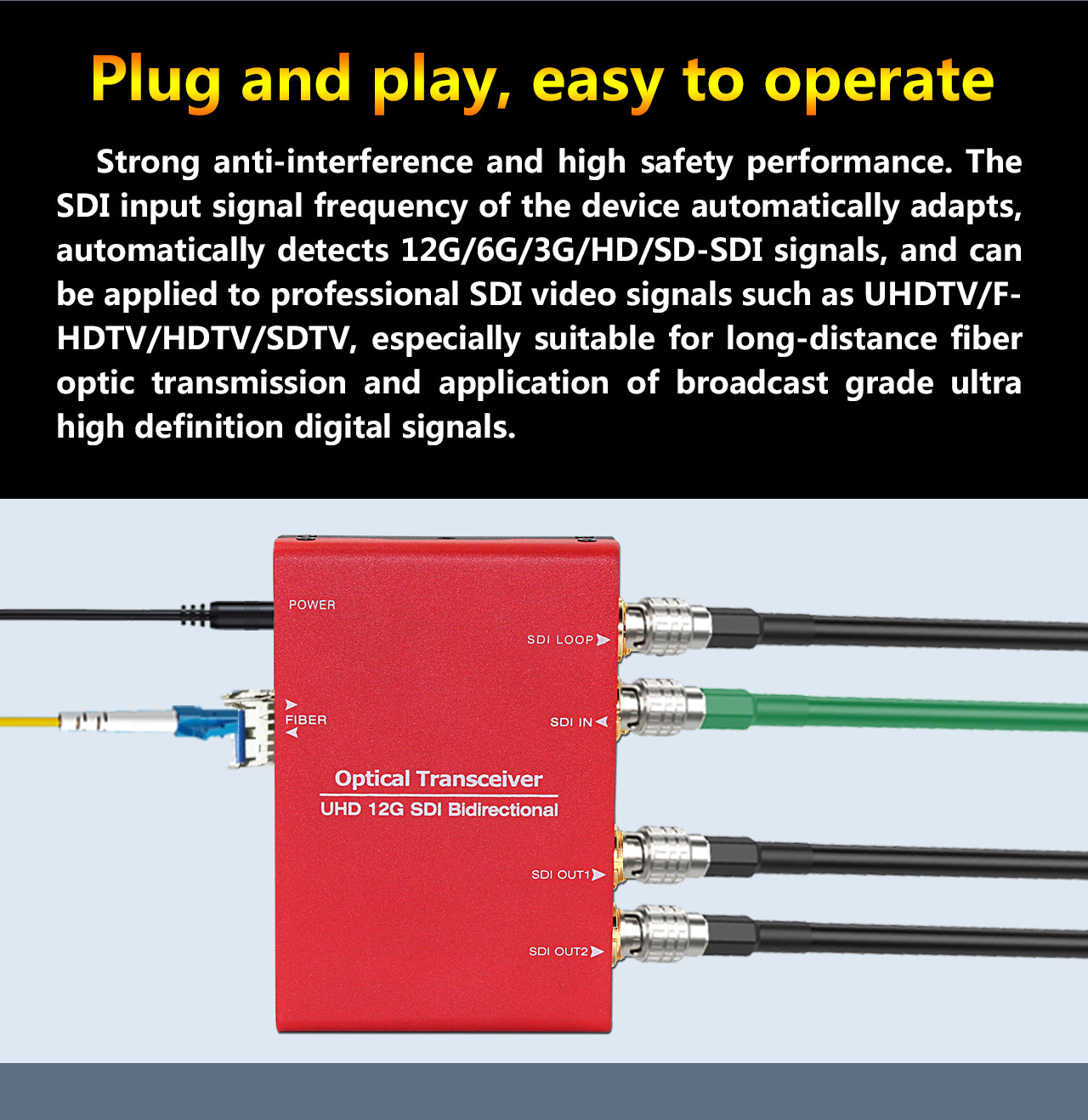 Strong anti-interference and high safety performance. The SDI input signal frequency of the device automatically adapts, automatically detects 12G/6G/3G/HD/SD-SDI signals, and can be applied to professional SDI video signals such as UHDTV/FHDTV/HDTV/SDTV, especially suitable for long-distance fiber optic transmission and application of broadcast grade ultra high definition digital signals.