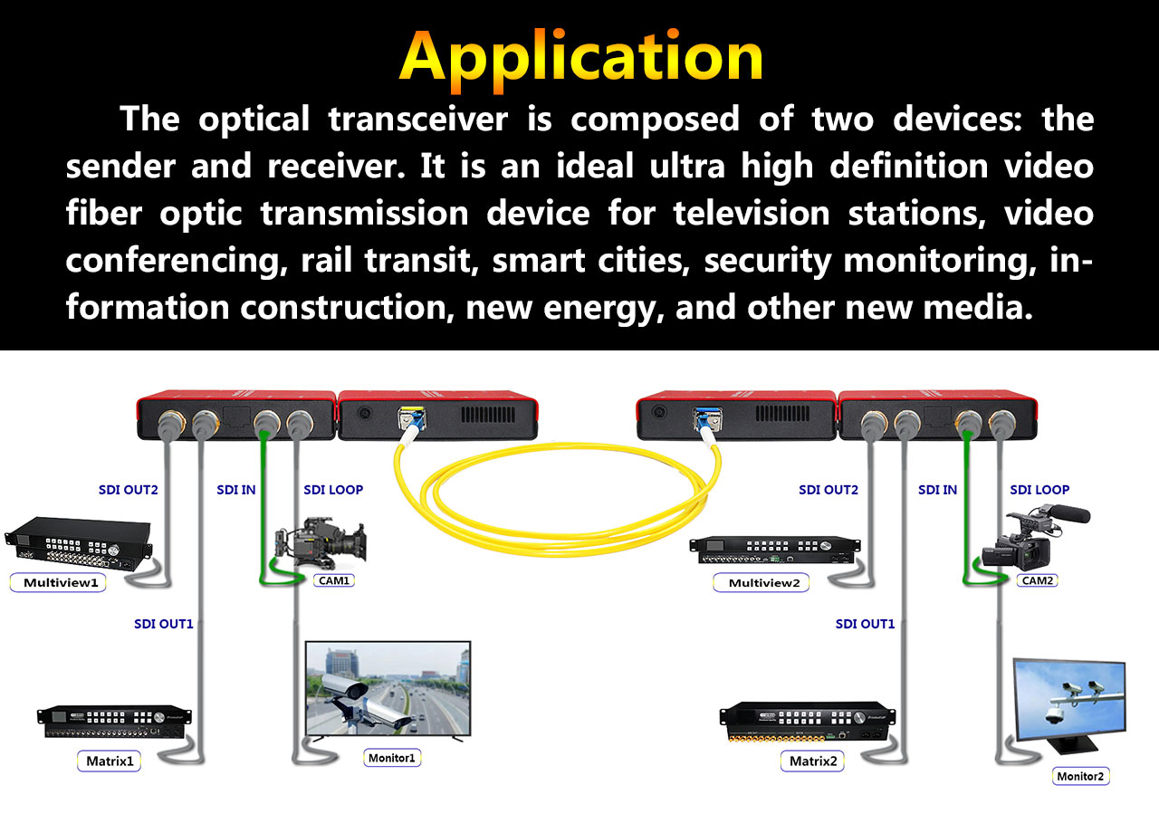 The optical transceiver is composed of two devices: the sender and receiver. It is an ideal ultra high definition video fiber optic transmission device for television stations, video conferencing, rail transit, smart cities, security monitoring, information construction, new energy, and other new media.