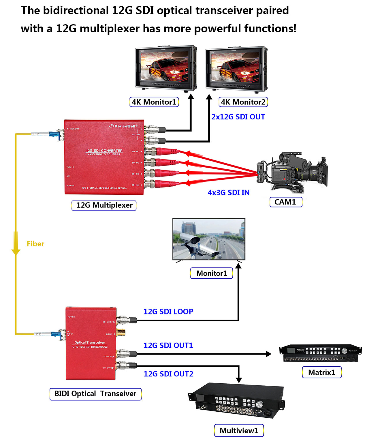 The bidirectional 12G SDI optical transceiver paired with a 12G multiplexer has more powerful functions!
