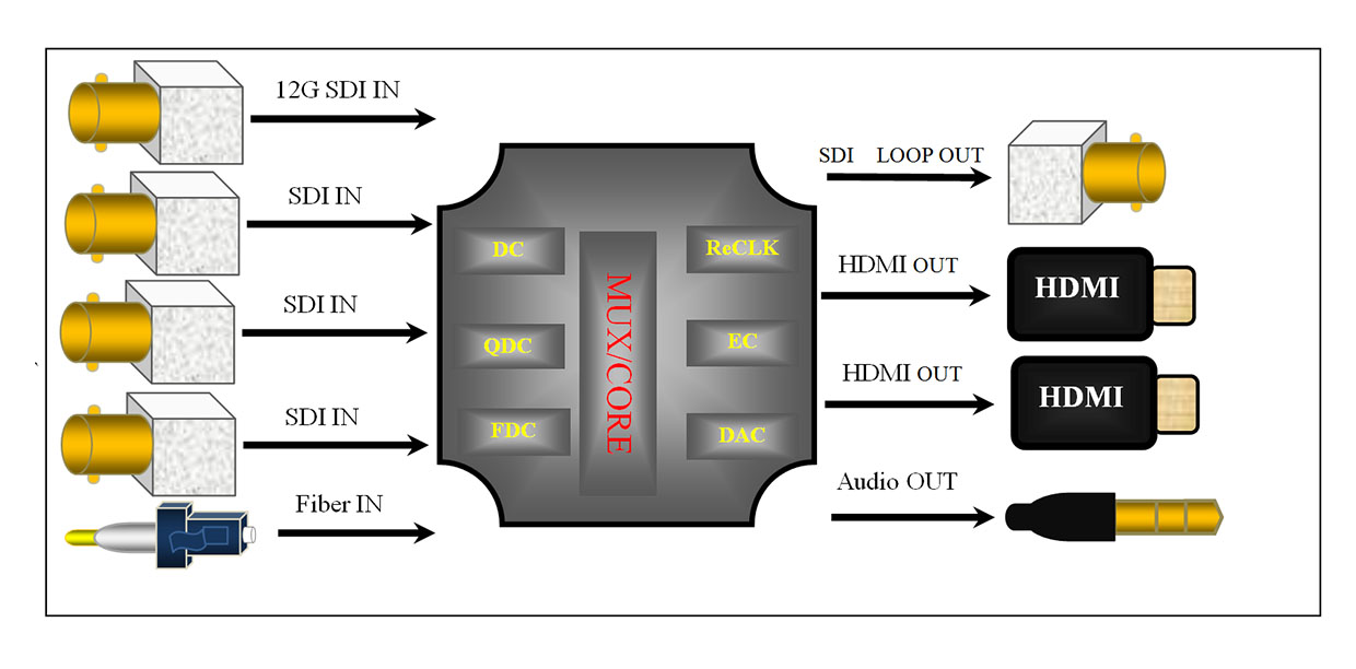A perfessional SDI to HDMI converter, Design based on devicewell technology. The device integrates FRCS (frame rate conversion system), SDI receiver and HDMI encoder,it can convert 12g / 6G / 3G / HD SDI signal into HDMI high-definition video signal. At the same time, pd2312 can also de embed the audio in SDI signal,output to HDMI and analog stereo port. Pd2312 integrated link conversion function,support single link and 4 link when UHD,3G / HD SDI signal is compatible with single link.