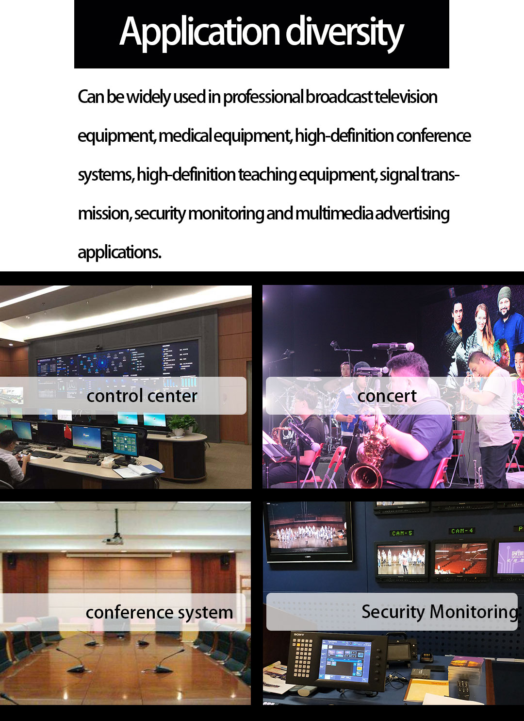 Can be widely used in professional broadcast television equipment, medical equipment, high-definition conference systems, high-definition teaching equipment, signal transmission, security monitoring and multimedia advertising applications.