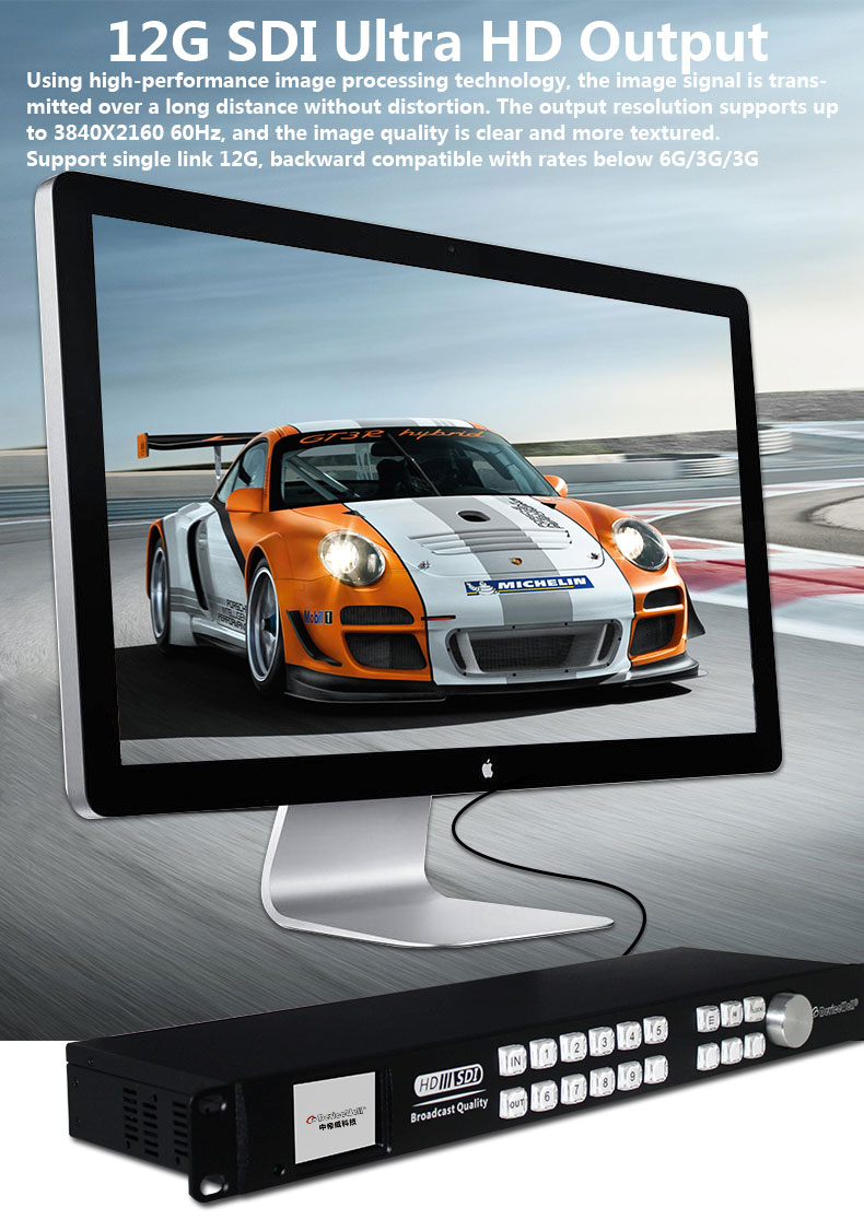 The equipment adopts high-performance digital processing chip, which can switch multiple SDI signal sources to multiple SDI compatible monitors or large screens.