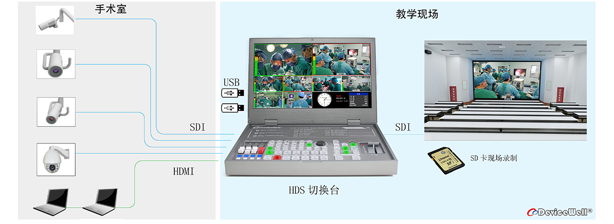 由于手术室对卫生和占用空间要求,因此系统采用专业高清怪手摄像机,手术室采集到的多个机位的信号,传输到后端的视频切换系统,在经过导播的切换将最清晰、最重要的画面切换出来展示在学员屏幕上,由于采用多机位、多角度拍摄,学员在观看的过程中更加容易和只管的发现手术的抄作细节,本套系统可以在紧张严谨的手术环境中更简单的获得更加专业的图像。