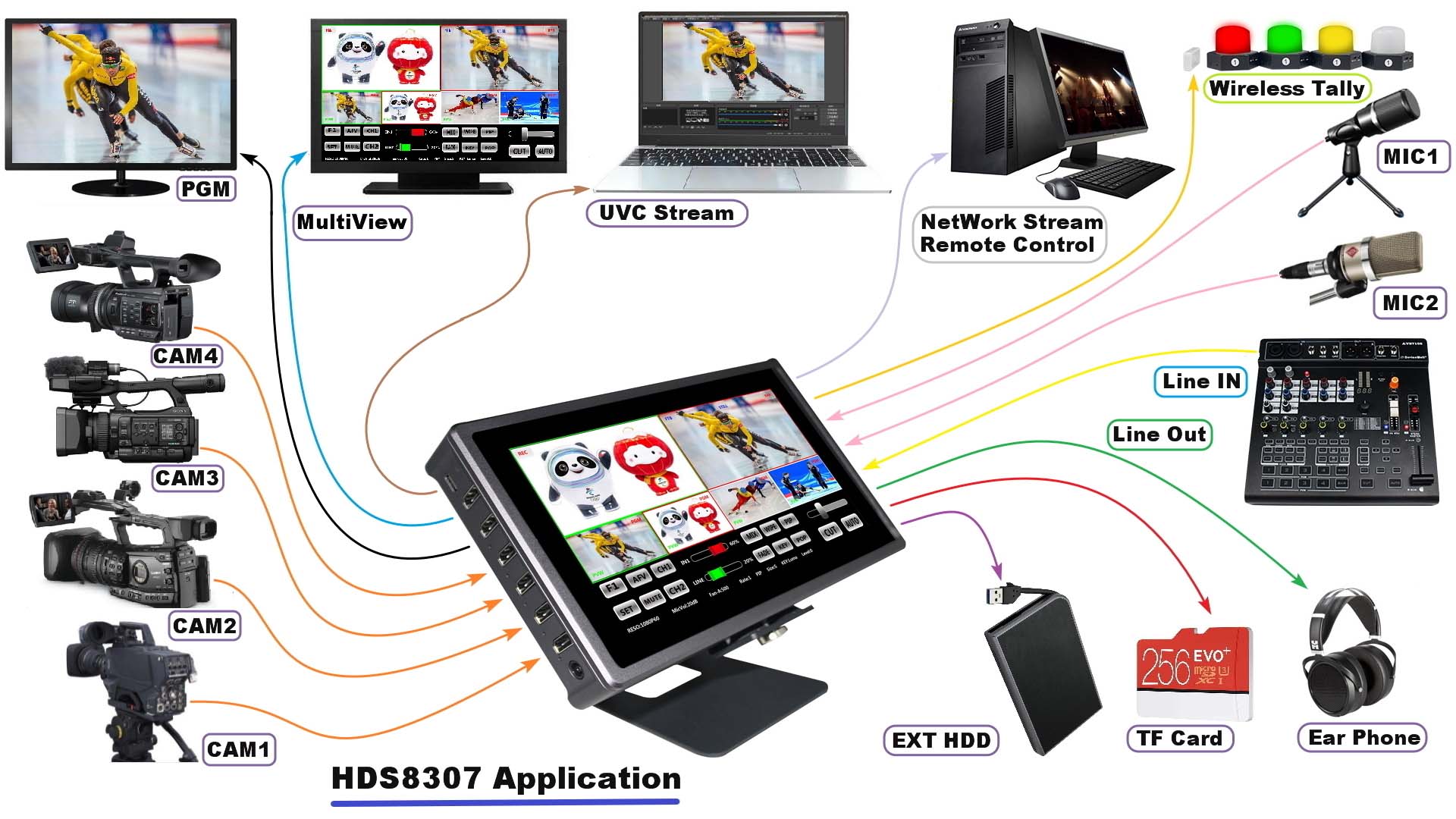 微型全功能切换台HDS8307,采用全触摸7寸液晶屏操作设计。设备集成多画面预监处理器、特效发生器、音频处理器及视频流媒体处理等切换台常用组件。接口支持4路HDMI输入,话筒及线路输入,PGM/MultiView输出,模拟音频输出及Tally输出。PGM视频流可通过UVC及RTMP网络流输出,也可以记录到TF卡或外置存储中。