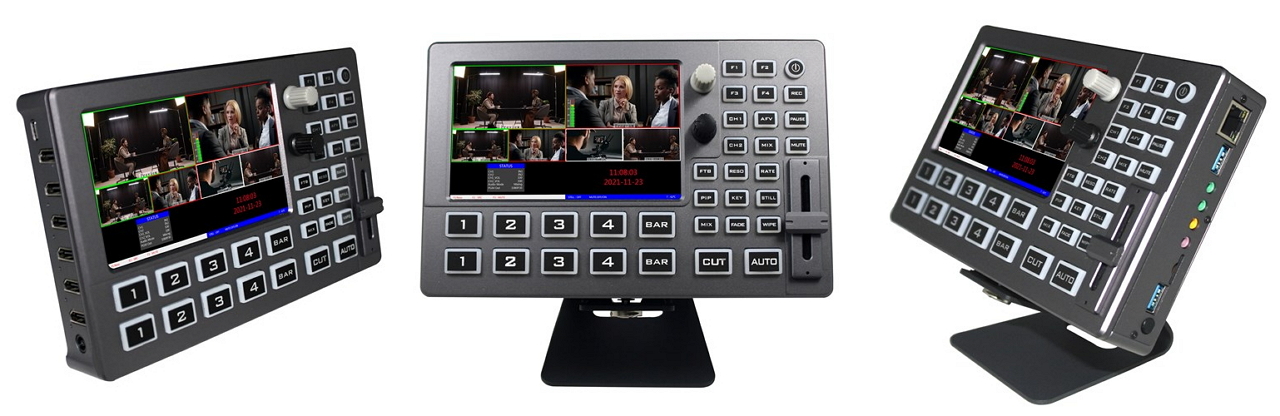 微型全功能切换台HDS8301,自带5寸液晶屏及物理按键。设备集成多画面预监处理器、特效发生器、音频处理器及视频流媒体处理等切换台常用组件。接口支持4路HDMI输入,话筒及线路输入,PGM/MultiView输出,模拟音频输出及Tally输出。PGM视频流可通过UVC及RTMP网络流输出,也可以记录到TF卡或外置存储中。