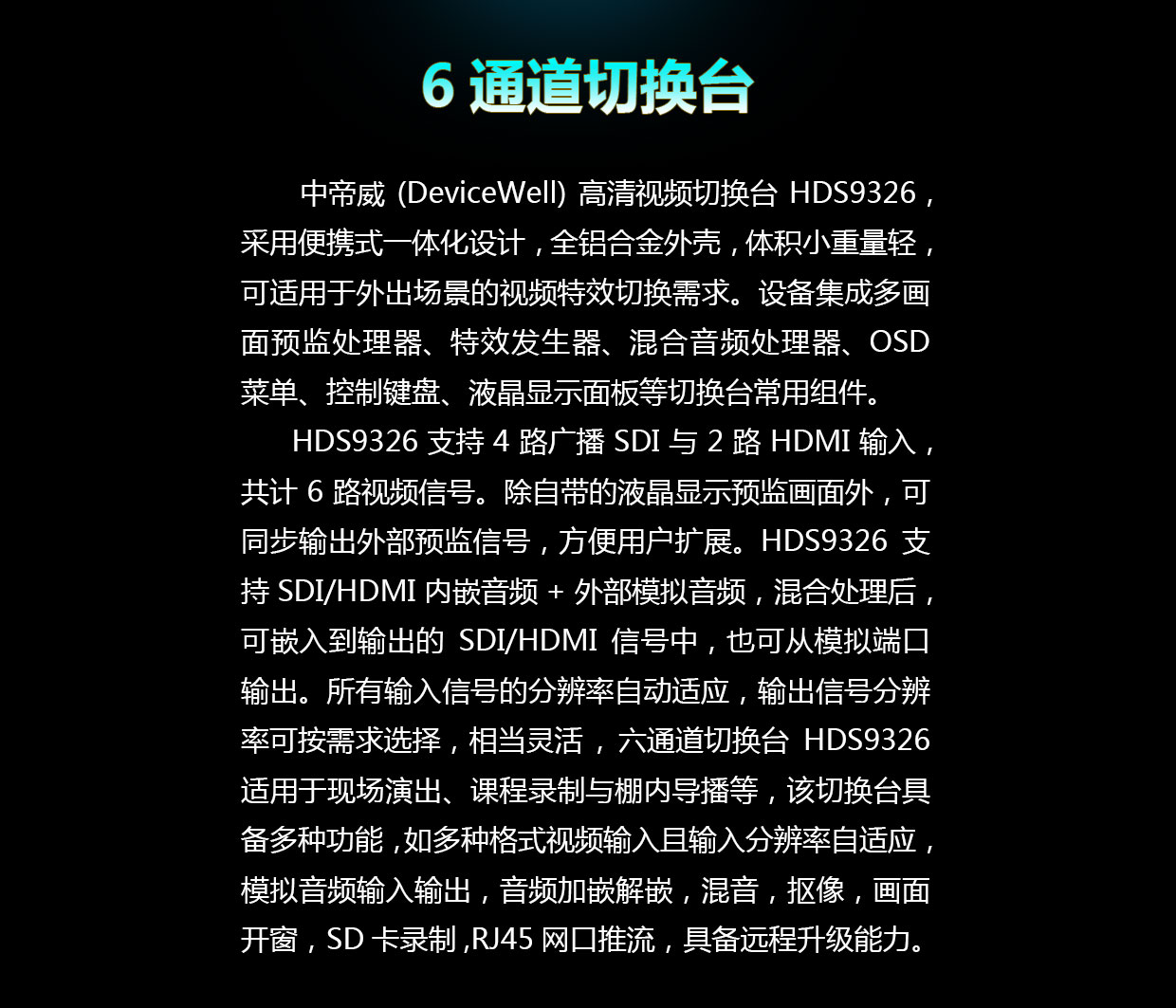 全新轻薄带录像双推流11.6寸监视器专业级全高清切换台HDS9326精致上市 HDS9326 4xSDI+2xHDMI 切换台 HDS9326支持4路广播SDI与2路HDMI输入,共计6路视频信号。除自带的液晶显示预监画面外,可同步输出外部预监信号,方便用户扩展。HDS9326支持SDI/HDMI内嵌音频+外部模拟音频,混合处理后,可嵌入到输出的SDI/HDMI信号中,也可从模拟端口输出。所有输入信号的分辨率自动适应,输出信号分辨率可按需求选择,相当灵活,HDS9326适用于现场演出、课程录制与棚内导播等,该切换台具备多种功能,如多种格式视频输入且输入分辨率自适应,模拟音频输入输出,音频加嵌解嵌,混音,抠像,画面开窗,SD卡录制,RJ45网口推流,具备远程升级能力。 查看详情 全新轻薄带录像双推流11.6寸监视器专业级全高清切换台HDS9326精致上市 中帝威HDS9326规格说明书资料 中帝威HDS9326图片资料 中帝威切换台/导播台相关资料下载 SDI 中帝威 切换台 应用案例 导播切换台 特效切换台 专业切换台 视频切换台 New Product New technolgy Fiber extender switcher 直播切换台 直播 直播带货 直播设备 导播台 SDI导播台 国产导播台应用 国产切换台应用 便携式导播台 < 上页 下页 >