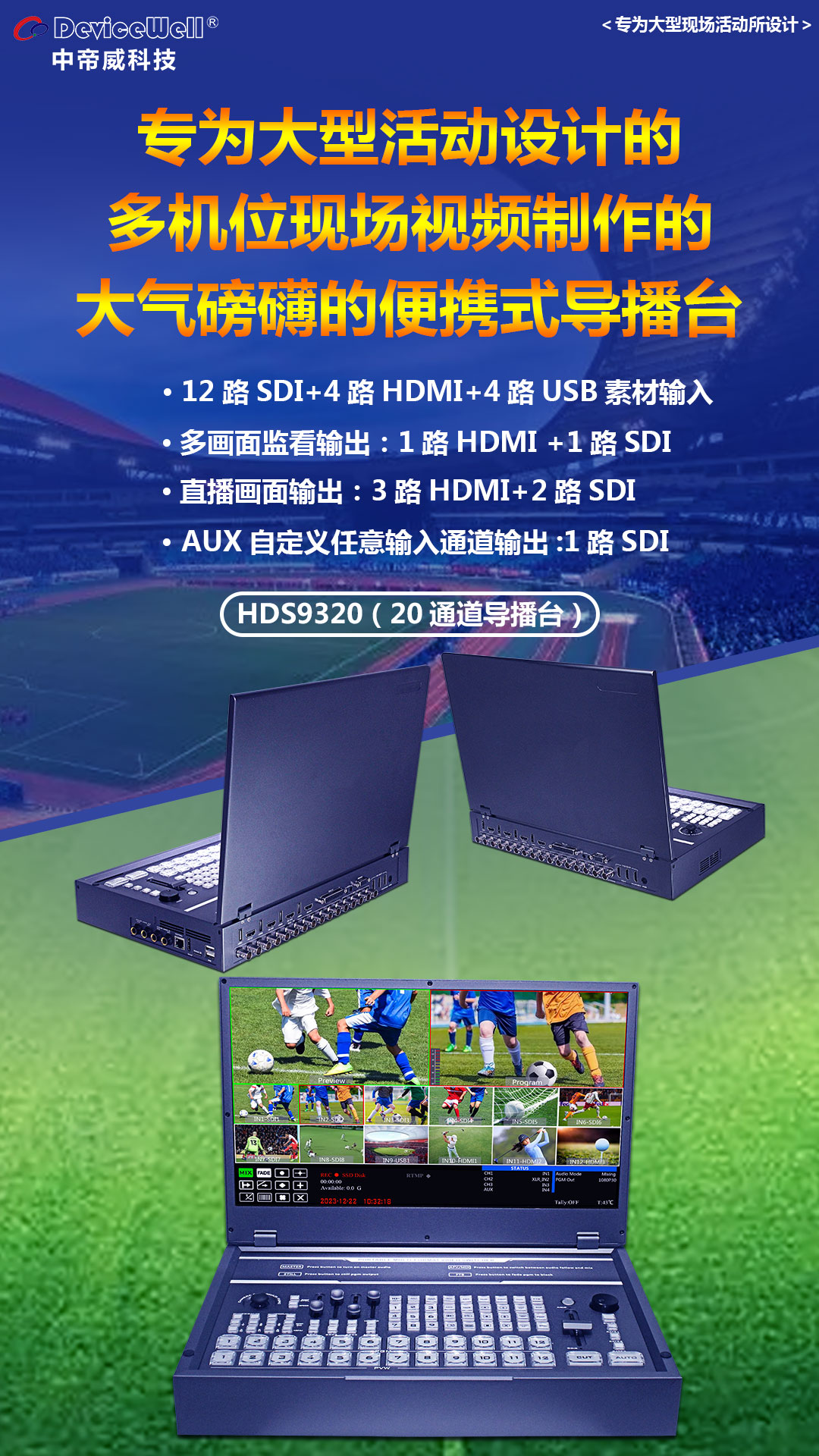 中帝威大型现场活动专用直播导播切换台HDS9320可让您为自己的体育活动打造明星球队风格的体育节目!不论是足球、乒乓球、保龄球或是棒球,导播台HDS9320都能连接多台视频摄影机,多角度无死角呈现赛况,将细节尽收眼底。您可以使用特效按键将图文叠加到游戏画面上层,看上去与专业体育节目无异!导播台HDS9320能帮您和朋友打造出具有广播级品质的现场体育节目,并实现网络流媒体直播!