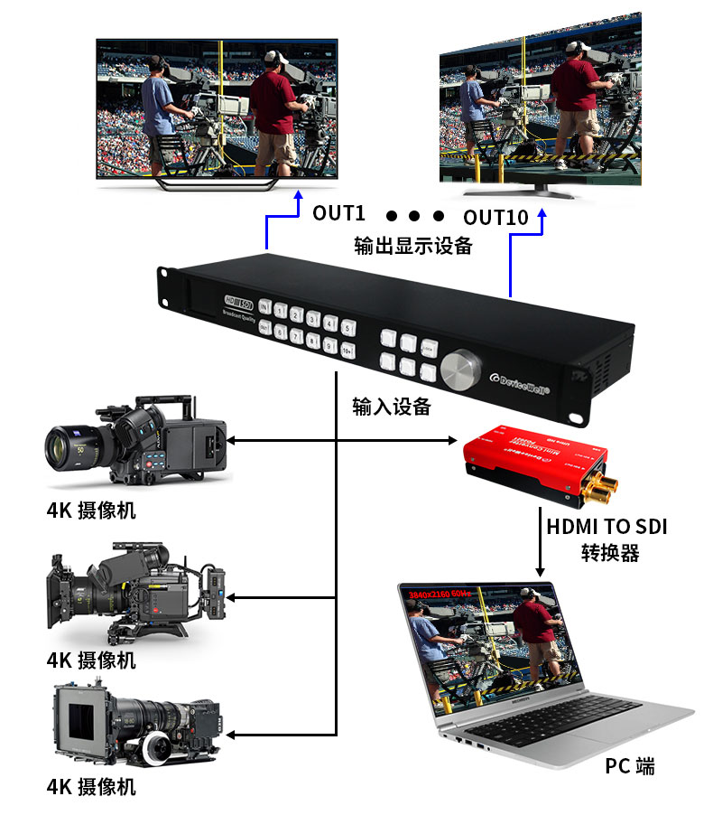 ·支持各种专业摄像机、PC端等多种设备输入,即插即用,操作灵活