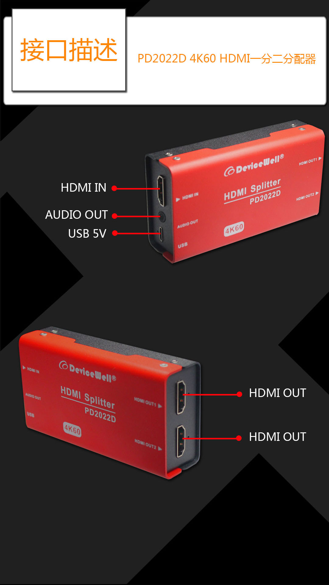 中帝威(DeviceWell) 专业级4K60 HDMI高清视频分配器PD2022D,一款专用的4K60 HDMI信号分配出2路HDMI信号的设备。设备集成4K60 HDMI 接收器及HDMI编码器,可方便的将一路4K60 HDMI信号分配为两路4K60HDMI,并将输入HDMI信号中的音频,嵌入到输出的两路HDMI信号中,支持一路HDMI输入信号分配成两路HDMI信号输出。 PD2022D输入信号自适应,输出分辨率与输入保持一致。可广泛应用于专业体育赛事、广播电视设备、医疗设备、高清会议系统、高清教学设备、信号转接及多媒体广告等应用领域。 Micro usb接口也用于设备供电,可适用于充电宝等USB移动设备供电系统。此外,设备配备1/4热靴镙丝,方便专业用户固定设备。